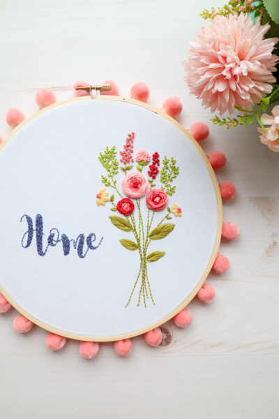 I love the simplicity of this floral home embroidery hoop art – it’s such a fun way to show how much you love being home with your people! Even if we’ve been having a lot of that lately. :) This is such a fun project to stitch up! I love the mix of colors in the floral bouquet but this…