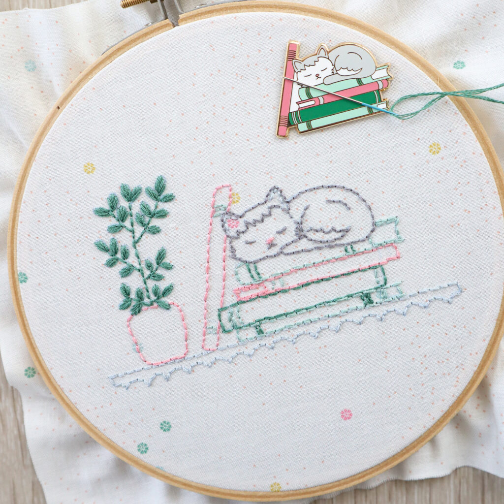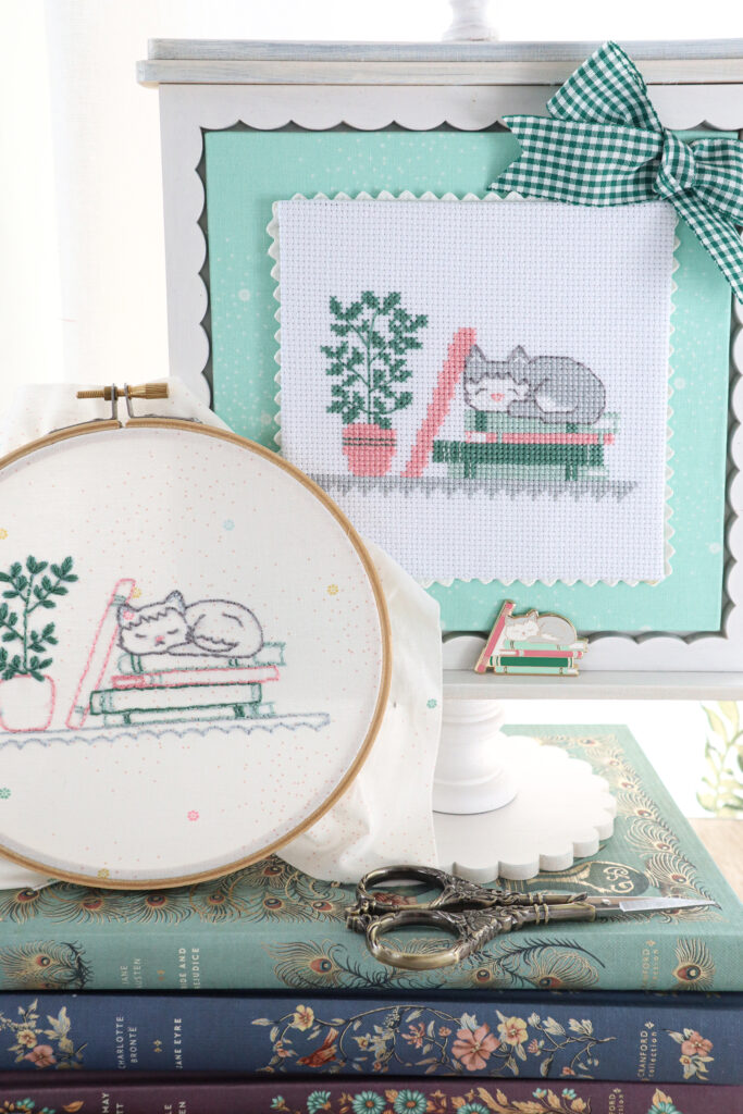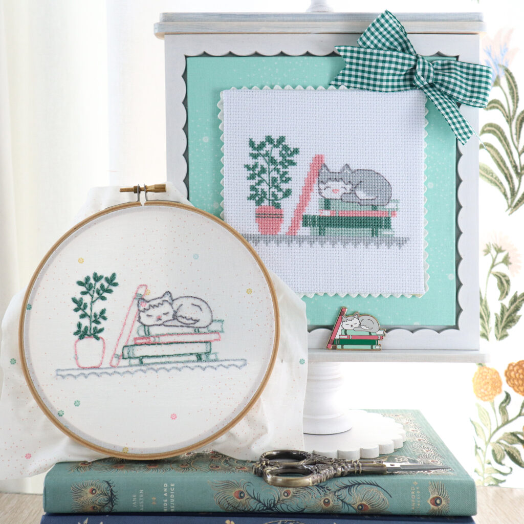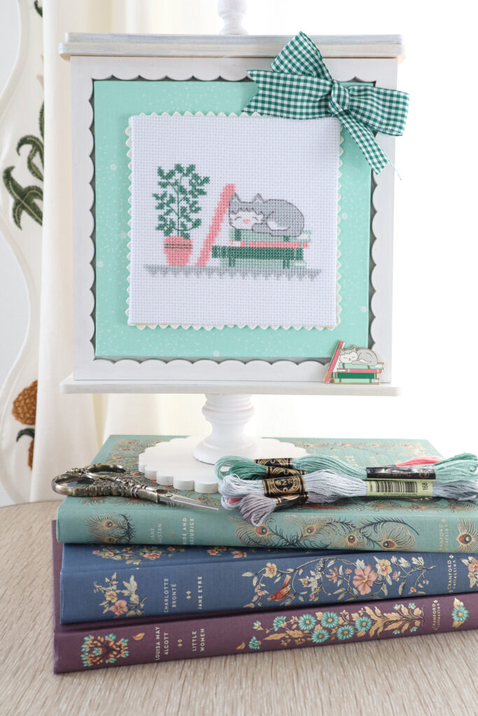 Our August box has the sweetest theme – a darling cat curled up for a nap on a stack of books. The colors are softer – greens, grays and pinks. They are such fun projects to stitch!