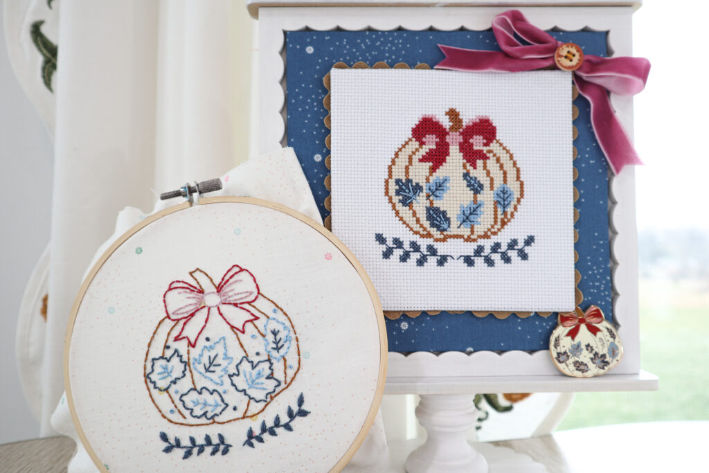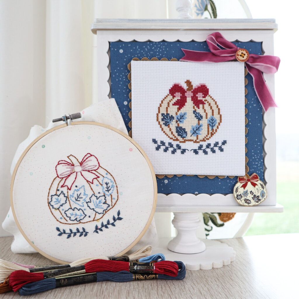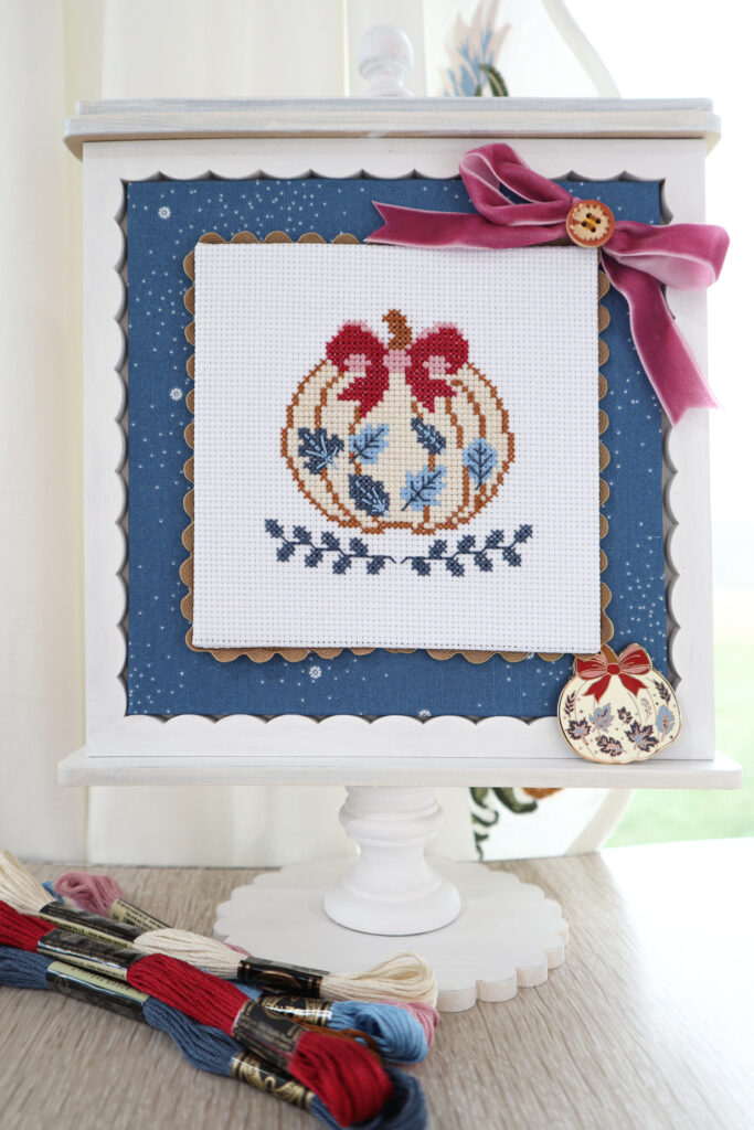 Our theme this month is this gorgeous Blue Willow Pumpkin. The navy and rose colors are inspired by Blue Willow plates and dinnerware, and I had so much fun designing this month’s set. Our pumpkins have pretty fall leaves in shades of blue, and they are finished with gorgeous bows.