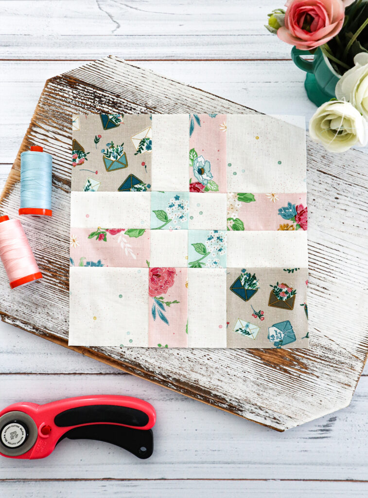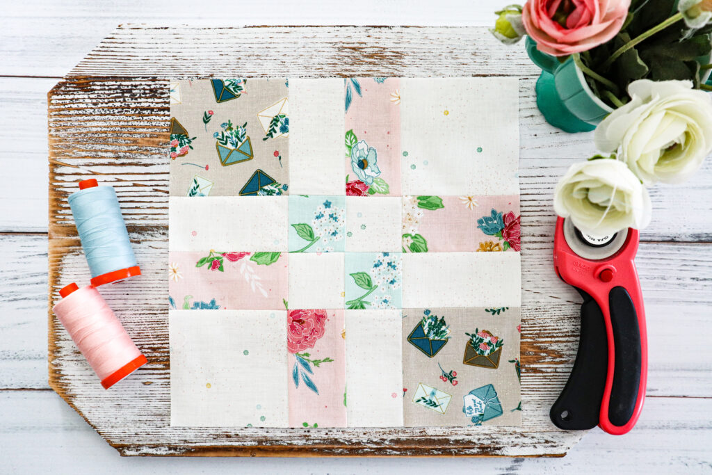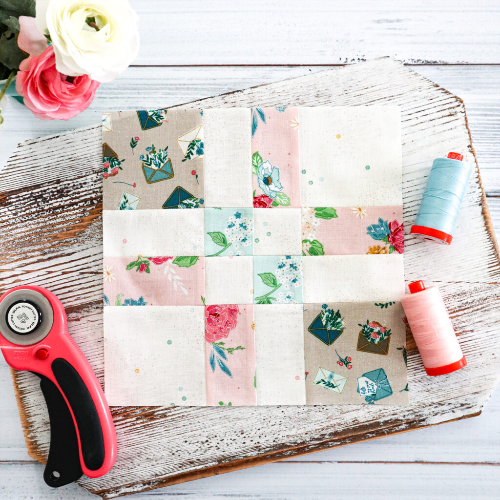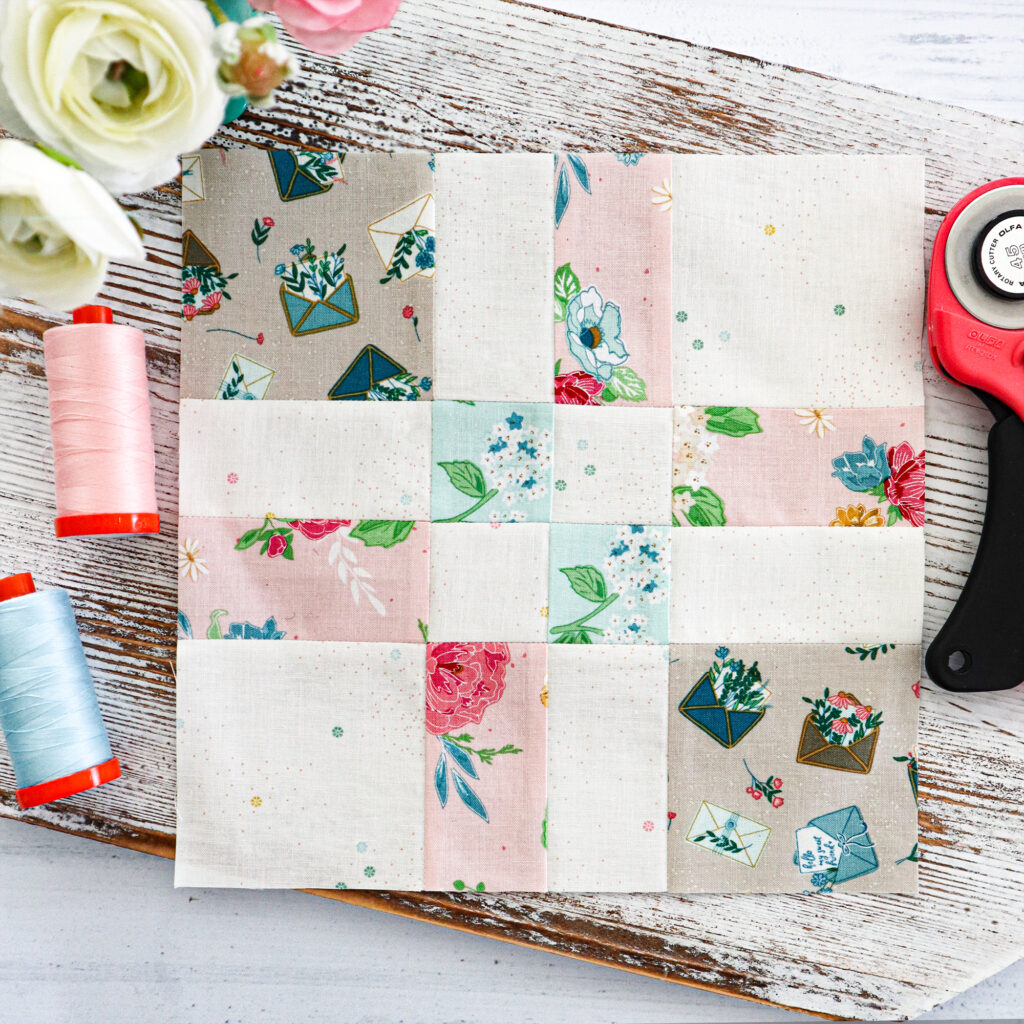 For my Twinsies block, I’m continuing to sew along with my upcoming fabric collection, Correspondence. I love seeing how the soft florals and sweet low volumes play together in this design — the little pops of aqua and pink feel so fresh and springy. The symmetry in this block really lets the prints shine!