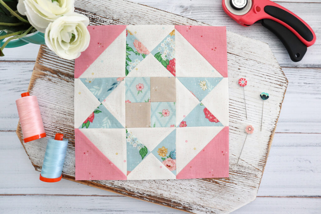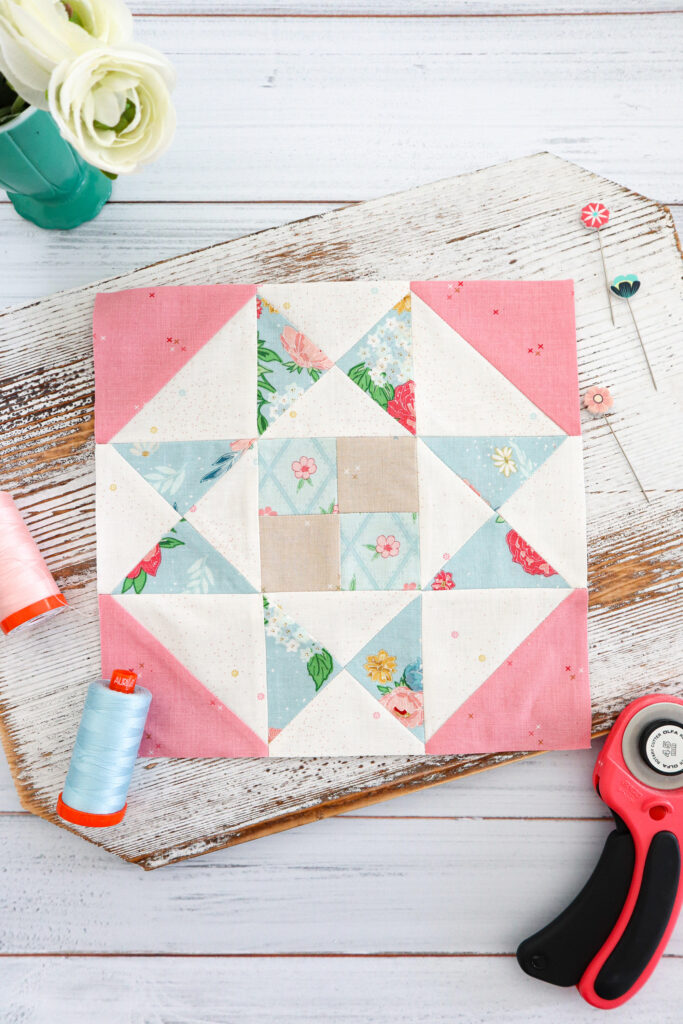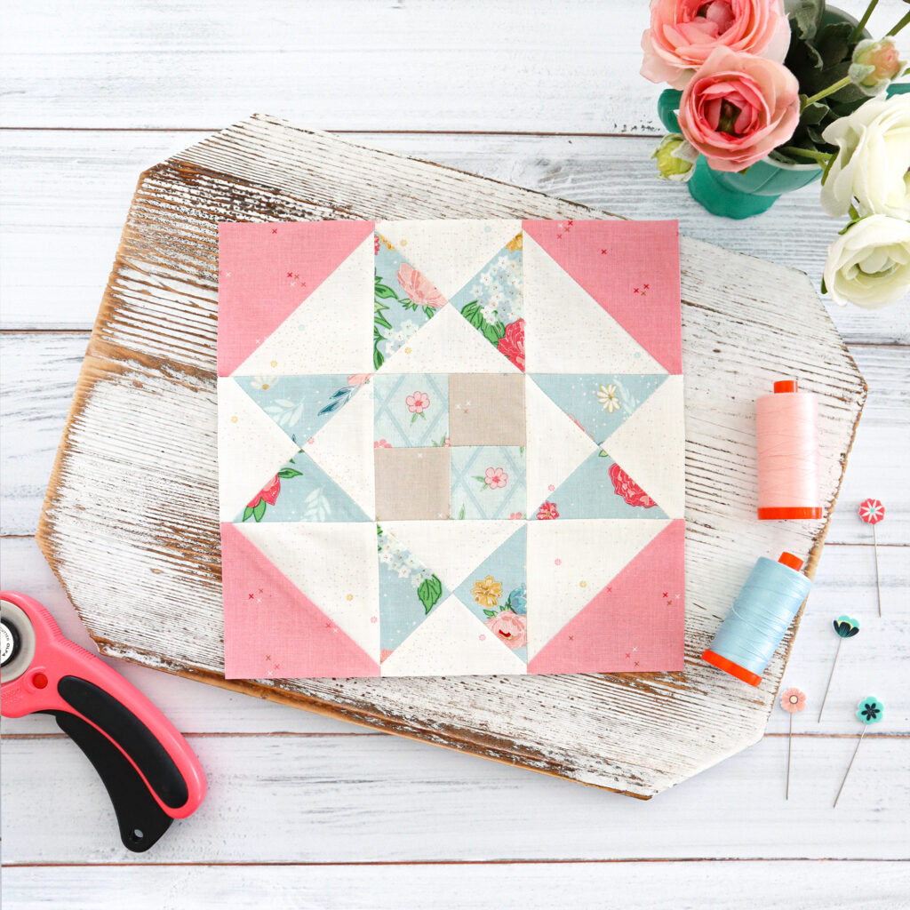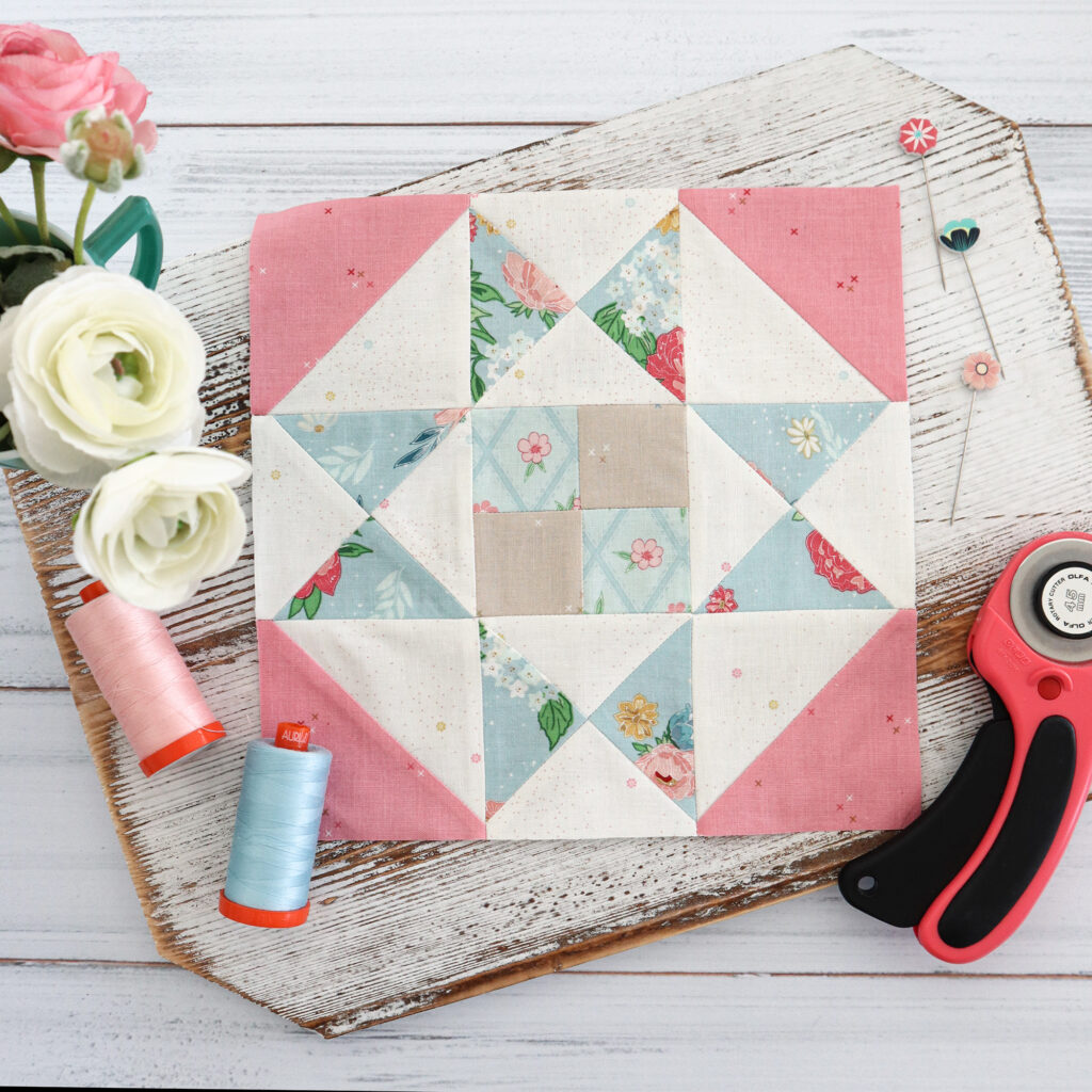 This week’s block is Idyllic, designed by Chelsi Stratton. I just love the balance of classic shapes in this block — it feels timeless and fresh all at once. The soft pink corners paired with the florals and low volume Dainty Daisy background give it such a sweet, romantic feel. It’s a lovely way to begin the quilt!