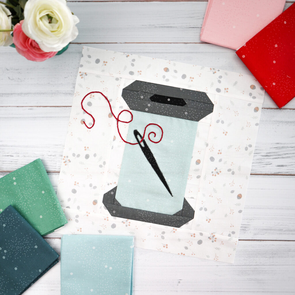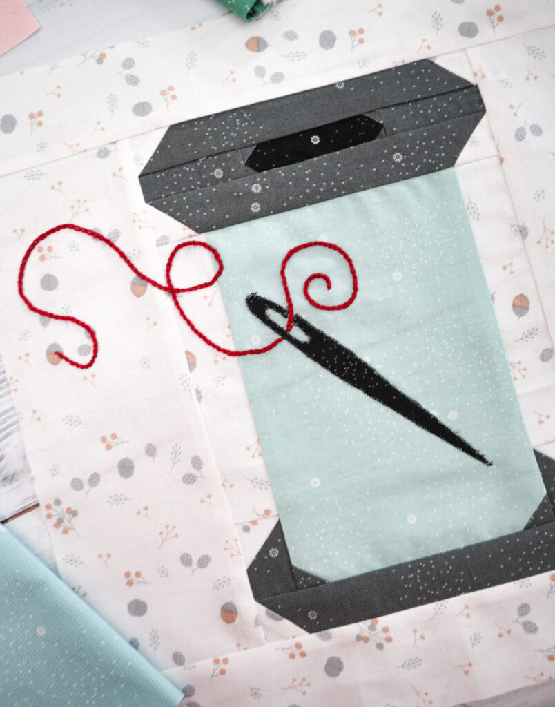 I used my Dainty Daisy colors: Songbird, Iron, and Licorice for the block and I added a pop of red with the embroidery floss. I used a chain stitch for the thread stitching. I really wanted that to pop and I love how it turned out. The pattern includes the needle for applique (I stitched mine down with invisible thread and a small zigzag stitch) and the twirly thread pattern as well.
